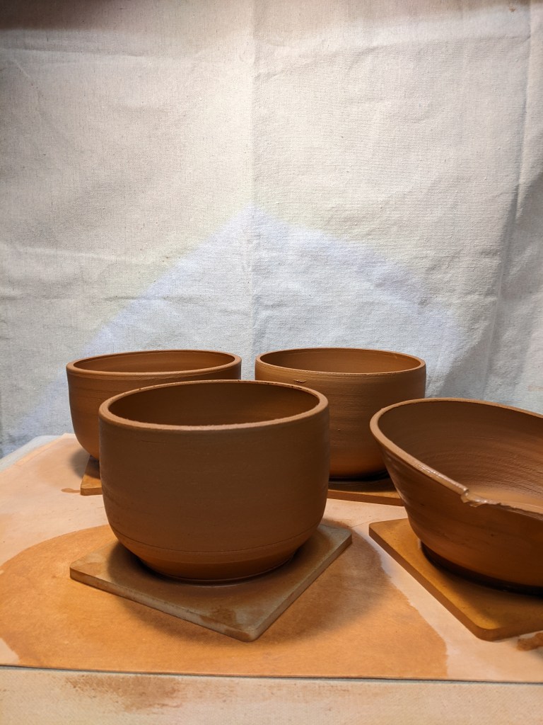 Next, I went for four medium sized bowls with a medium brown clay (cafe cinco, from Aardvark). I foolishly thought the bowls would be relatively easy too but make them the same shape was so hard! The curve on each bowl was at varying heights even though I was referencing a ruler and calipers.